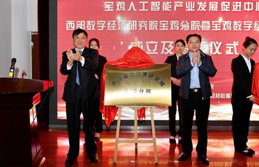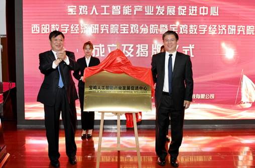 尹清辽和白黎共同为“宝鸡人工智能产业发展促进中心”揭牌,白黎和陈鹏飞共同为“西部数字经济研究院宝鸡分院暨宝鸡数字经济研究院”揭牌。