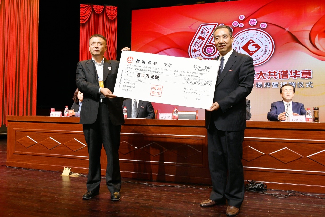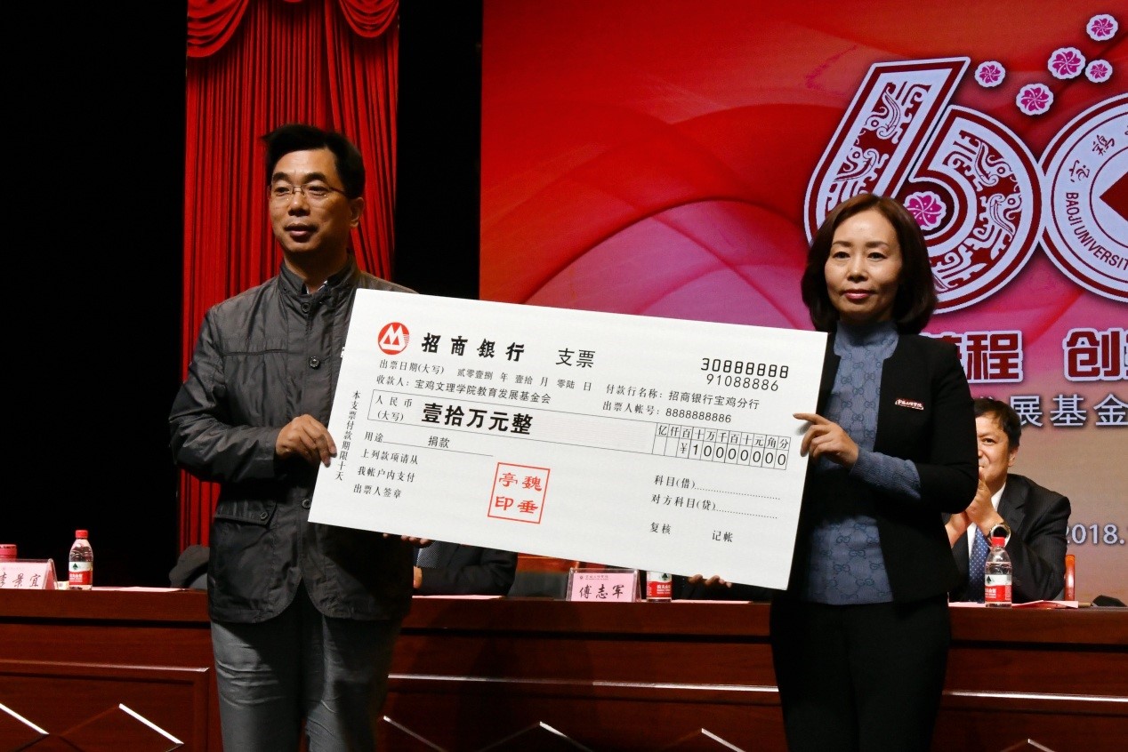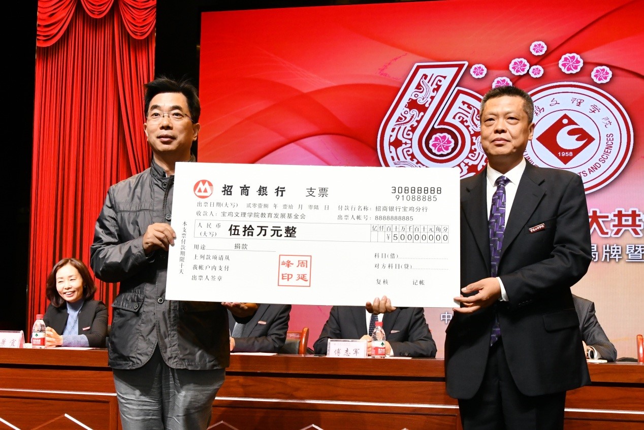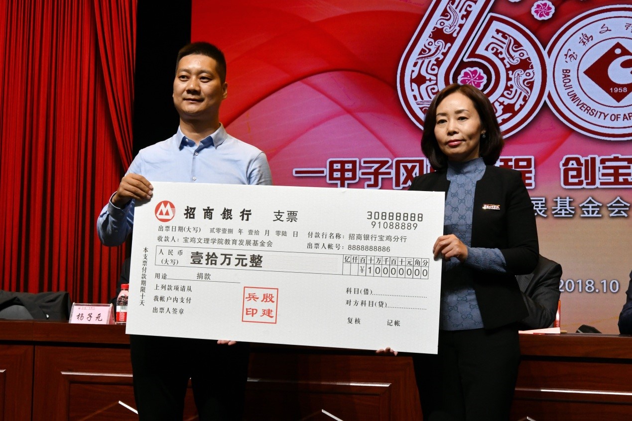 捐赠仪式上,数学与信息科学学院90级校友宁远喜向母校捐赠1000万元;文学与新闻传播学院84级校友、陕西联兴房地产开发公司董事长徐洲成,经济管理学院93级校友、上海经纬建筑规划研究院宁波分院院长赵宏斌分别向母校捐赠100万元;经济管理学院93级校友、陕西欧艺高商贸有限公司董事长王晓东,经济管理学院93级校友、西安博宇节能环保科技有限公司董事长杨旺团,政法学院92级校友、浙江博方律师事务所主任周延峰分别向母校捐赠50万元;北京校友分会副会长、西安和而不同文化产业发展有限公司董事长王丰向学校捐赠33.9万元;外国语学院92级校友、宁波太阳湖工艺品公司总经理魏垂亭,物理与光电技术学院03级校友、宝鸡英创教育董事长殷建兵分别向母校捐赠10万元;在beat365官网工作36年的退休职工杨别科捐赠价值68万元教学设备;歌山集团总经理王志华捐款5万元;宝鸡正徽酒业营销策划有限公司总经理吴永利为学校捐赠了价值6万余元的物资;美术学院96级校友、山东校友分会会长王治国,体育学院98级校友、陕西亚华环境工程有限公司总经理付斌林,宝鸡市汉唐图书有限责任公司刘建华,青岛啤酒汉斯宝鸡有限公司党委书记、董事长兼总经理孔锁贤,西安厚朴餐饮管理有限公司金有民也慷慨解囊,为学校捐赠。