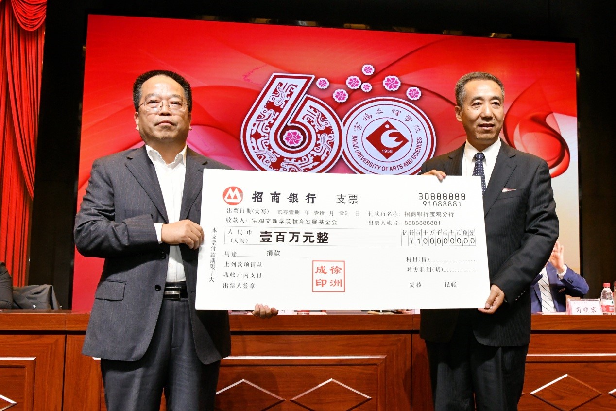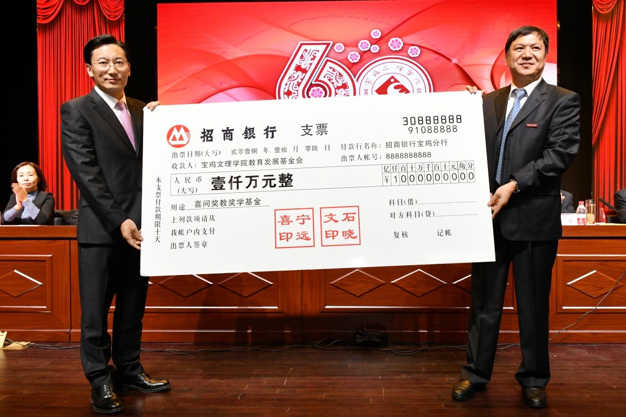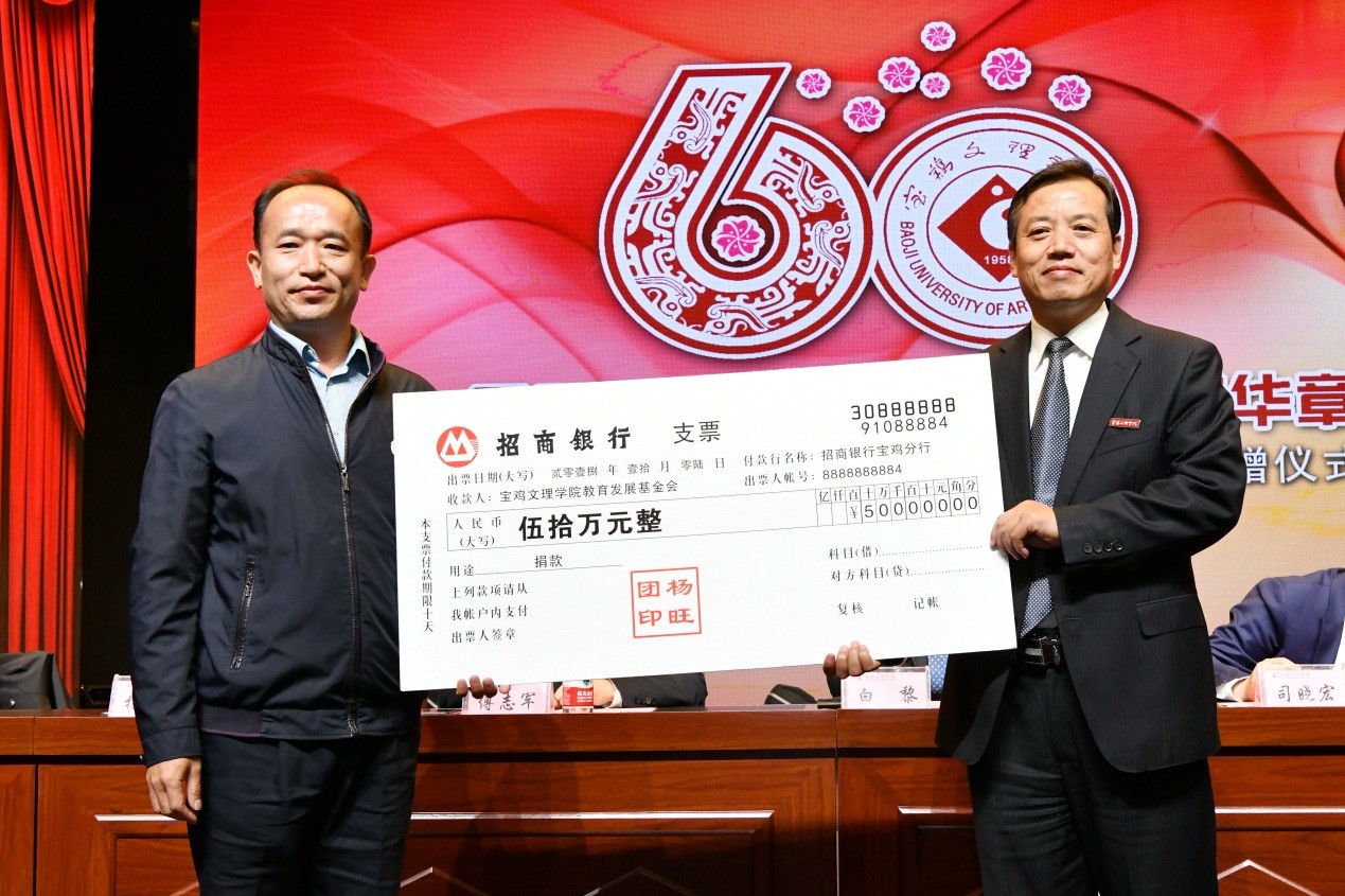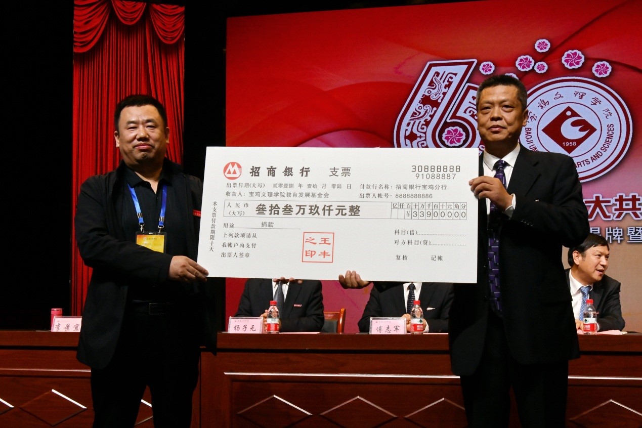 捐赠仪式上,数学与信息科学学院90级校友宁远喜向母校捐赠1000万元;文学与新闻传播学院84级校友、陕西联兴房地产开发公司董事长徐洲成,经济管理学院93级校友、上海经纬建筑规划研究院宁波分院院长赵宏斌分别向母校捐赠100万元;经济管理学院93级校友、陕西欧艺高商贸有限公司董事长王晓东,经济管理学院93级校友、西安博宇节能环保科技有限公司董事长杨旺团,政法学院92级校友、浙江博方律师事务所主任周延峰分别向母校捐赠50万元;北京校友分会副会长、西安和而不同文化产业发展有限公司董事长王丰向学校捐赠33.9万元;外国语学院92级校友、宁波太阳湖工艺品公司总经理魏垂亭,物理与光电技术学院03级校友、宝鸡英创教育董事长殷建兵分别向母校捐赠10万元;在beat365官网工作36年的退休职工杨别科捐赠价值68万元教学设备;歌山集团总经理王志华捐款5万元;宝鸡正徽酒业营销策划有限公司总经理吴永利为学校捐赠了价值6万余元的物资;美术学院96级校友、山东校友分会会长王治国,体育学院98级校友、陕西亚华环境工程有限公司总经理付斌林,宝鸡市汉唐图书有限责任公司刘建华,青岛啤酒汉斯宝鸡有限公司党委书记、董事长兼总经理孔锁贤,西安厚朴餐饮管理有限公司金有民也慷慨解囊,为学校捐赠。