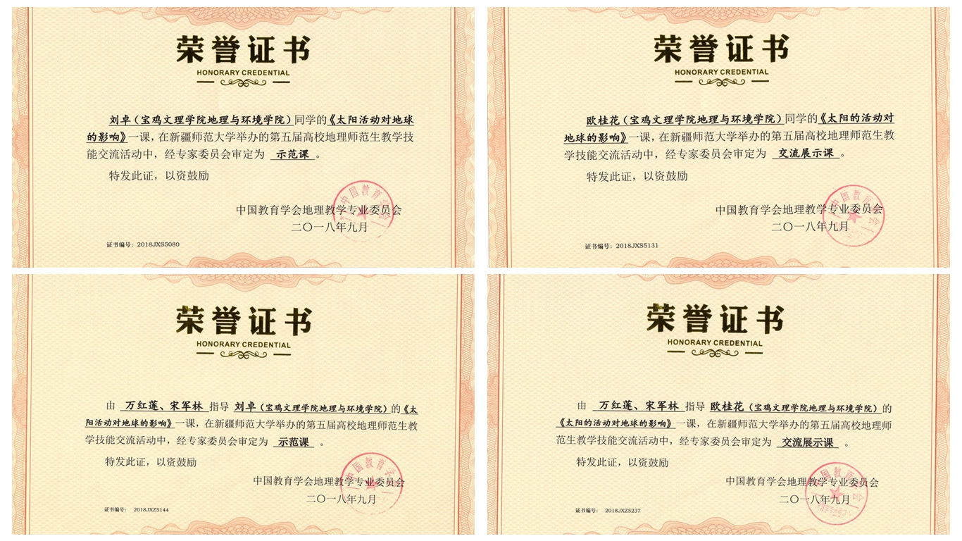 9月28日至30日,中国教育学会地理教学专业委员会在新疆师范大学举办了第五届高校地理师范生教学技能大赛暨“落实核心素养,提升地理实践力,地理研学旅行理论与实践”研讨会。beat365官网地理与环境学院2015级地理科学专业本科生刘卓、欧桂花参加了本次教学技能大赛并取得佳绩,其中,刘卓获“示范课”奖(二等奖),欧桂花获“交流课”奖(三等奖),指导教师万红莲、宋军林被评为优秀指导教师。