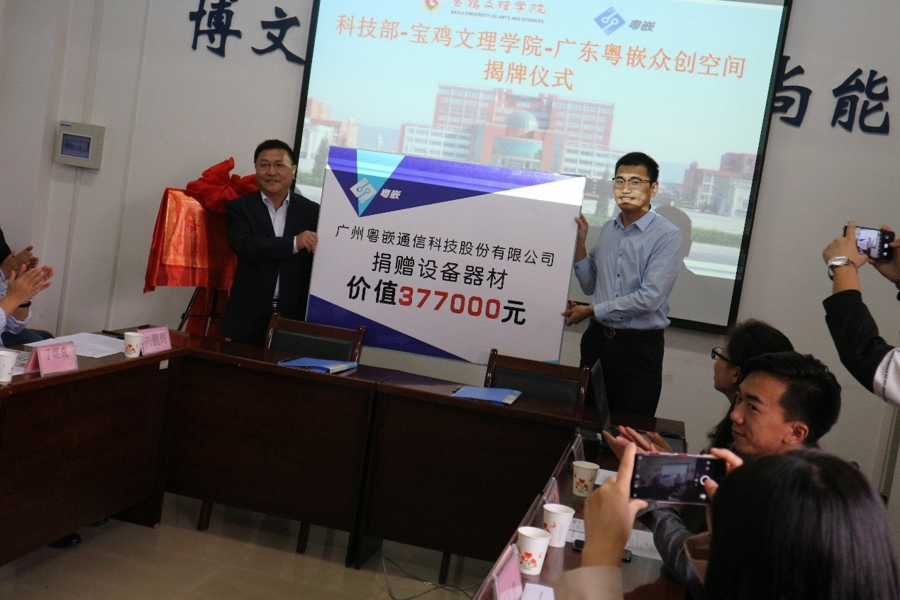 10月5日,由科技部、beat365在线唯一官网、广州粤嵌通信科技股份公司共同发起成立的“众创空间”揭牌暨仪器与设备捐赠仪式在beat365官网老校区举行。副校长杨子元、李景宜与广州粤嵌西安中心总经理王乐忠及校企合作部总监高博龙为“众创空间”揭牌。