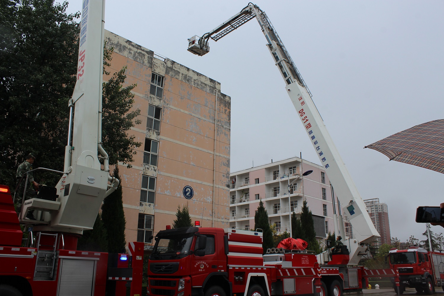 应急疏散演练分为火灾报警、现场警戒、灭火处置、组织疏散、举高平台消防车救人、现场救护等环节。上午10:00,在一阵急促的警报声中“消防应急疏散演习”活动的序幕拉开了。2号学生公寓五楼浓烟滚滚,参加演练的学生在宿舍管理人员的引导下用湿毛巾捂住口、鼻,保持弯腰姿势从火灾现场按楼层经过安全通道有序撤离。三辆“119”消防车迅速到达火灾现场,高喷消防车迅速启动向2号学生公寓着火点实施高压喷水灭火,登高平台消防车成功营救六楼一名被困学生,医护人员抬着担架立即实施现场抢救。最终“大火”被顺利扑灭。整个演练秩序井然,全体师生态度认真,动作规范,行动迅速。