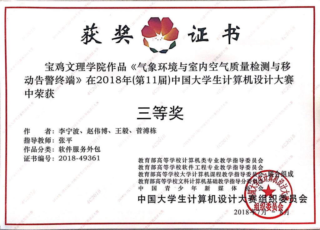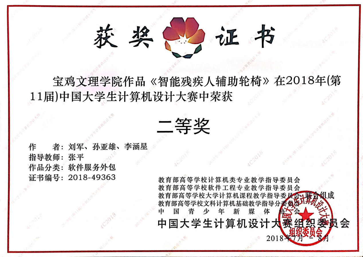 日前,2018年第十一届中国大学生计算机设计大赛全国总决赛落下帷幕,beat365官网学生参加了浙江工商大学和东华大学软件服务外包组和软件应用与开发组总决赛并取得了佳绩。由beat365官网计算机学院张平老师指导、计算机学院学生刘军、孙亚雄、李涵星设计的《智能残疾人辅助轮椅》作品,计算机学院学生李宁波、赵伟博、王毅、菅浦栋设计的《气象环境与室内空气质量检测与移动告警终端》作品,计算机学院学生高晨、高泽宁、王磊设计的《基于人机交互的魔镜系统》作品经过与入围总决赛550余支队伍的激烈角逐,分别夺得全国总决赛二等奖和三等奖。