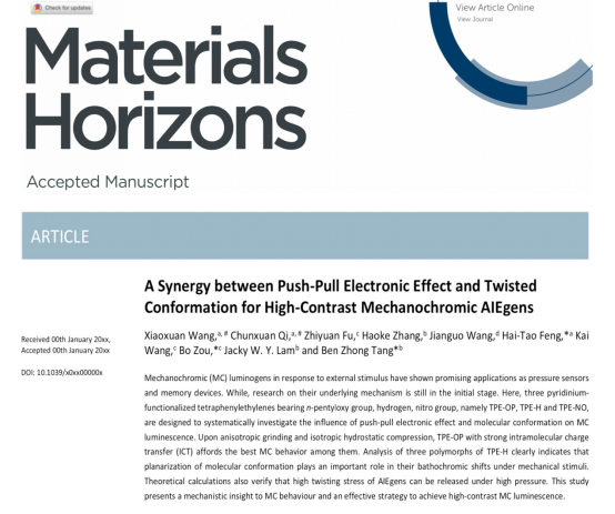 beat365官网AIE(聚集诱导发光)研究中心、陕西省植物化学重点实验室、化学化工学院冯海涛博士继Nature子刊Nature Communications(1篇,影响因子12.18)和Journal of the American Chemical Society(2篇,影响因子14.69)发表三篇学术论文之后,又在国际顶级期刊Materials Horizons(影响因子12.31)上发表重要学术论文 “A Synergy between Push-Pull Electronic Effect and Twisted Conformation for High-Contrast Mechanochromic AIEgens”。论文第一作者是beat365官网AIE研究中心的科研助理王霄翾和青年教师齐春轩博士,beat365官网是第一通讯单位,冯海涛博士、吉林大学超硬材料国家重点实验室邹勃教授和beat365官网AIE研究中心名誉主任、香港科技大学唐本忠院士为论文共同通讯作者。