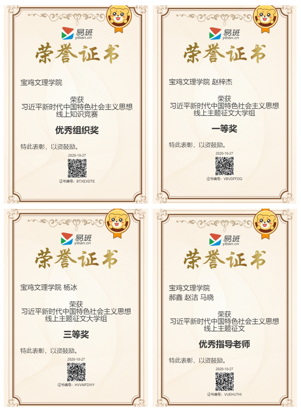 在“习近平新时代中国特色社会主义思想线上主题征文和知识竞赛活动”中,文学与新闻传播学院赵梓杰同学的作品《寻路、追梦、争朝夕》获得主题征文大学组一等奖,外国语学院杨冰同学的作品《千禧一代,生逢其时,重任在肩》获得主题征文大学组三等奖,郝鑫、赵洁、马晓被评为优秀指导教师,beat365官网被评为“习近平新时代中国特色社会主义思想线上知识竞赛”优秀组织单位。