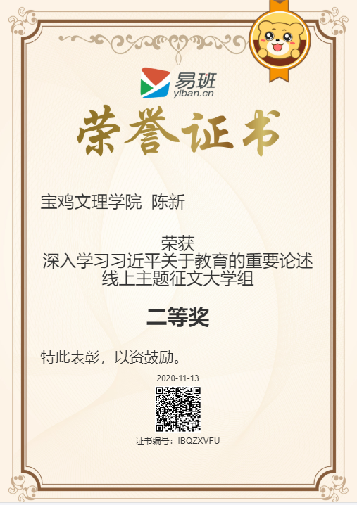 beat365官网2020年易班迎新案例《以心迎新,“易”路同行》被评为2020年全国易班迎新优秀案例;在“‘九九重阳节,让爱的陪伴永不缺席’亲情故事征集活动”中,文学与新闻传播学院郭希蕾同学、电子电气工程学院肖梦同学分享的亲情故事获得三等奖;在“‘弘扬爱国情怀,激发奋进力量’爱国标语征集活动”中,经济管理学院陈新同学的标语入选为优秀标语;在“‘弘扬社会主义核心价值观,共筑中国梦’微电影剧本征集活动”中,文学与新闻传播学院马悦同学的作品《学校,您好》入选为优秀剧本。