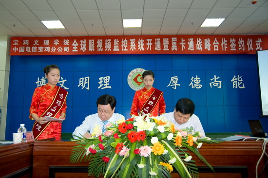 米晓东在签约仪式上作了讲话。他指出,维护校园稳定安全是学校教育管理工作的重要保障。党中央历来高度重视各级各类学校稳定安全工作,省委省政府以及省委教育工委反复强调加强校园安全稳定的极端重要性和紧迫性。特别是近期多起校园恶性事件的发生,引起了社会各界的高度关注。在这样的大背景下,校园数字监控系统的正式交付使用,对于提升学院人防、物防和技防水平,维护校园稳定安全必将起到积极的作用。实现了对全院重点单位、重要部位、交通要道等区域的监控,进一步提高了维护校园稳定的能力,确保了校园的稳定安全。他说,宝鸡电信分公司与学院签订“翼卡通”项目合作意向书,为学院提供“翼卡通”业务平台及所需设备,建立餐厅、超市、图书馆、公寓及教学、办公考勤等“翼卡通”业务,给师生员工的学习和生活提供更为便捷、高效的服务,将为全面推进我院数字化校园建设打下坚实的基础。他希望宝鸡电信分公司和学院相关部门进一步通力合作,共同做好设备的日常维护,确保数字监控系统的正常运转,尽早组织实施“翼卡通”系统的配置,使双方在校园现代化、信息化建设中实现“双赢”。