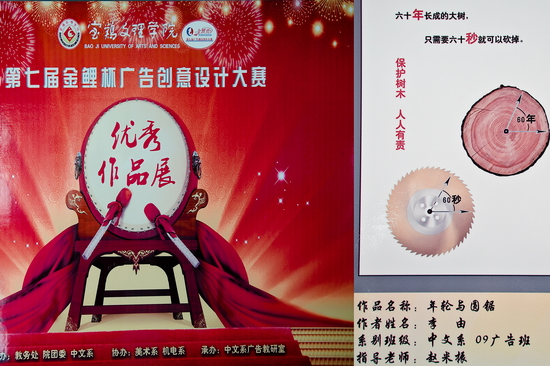 本次大赛以“道德、环保、民生、世园”为主题,面向全院征集作品,共收到包括平面广告、影视广告、策划书、创意脚本等类别的参赛作品380余幅,评选并展出获奖作品79幅。