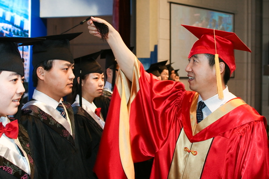 在学位授予仪式上,伴随着优美的钢琴旋律,毕业生依次上台,王志刚亲自为毕业生颁发学士学位证书,与他们亲切握手、寄语祝福并合影留念。傅志军、赵荣侠分别为全院17个系的毕业生一一扶正流苏、整帽拨冗。