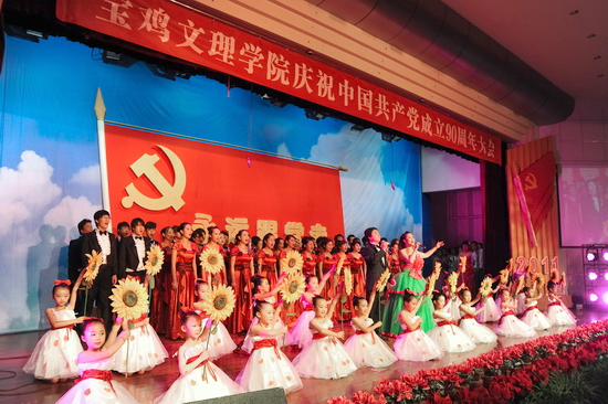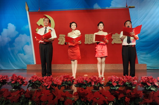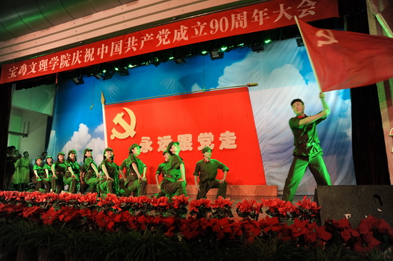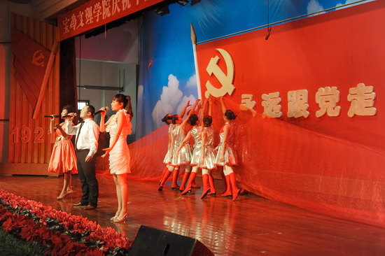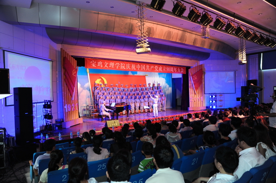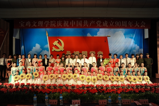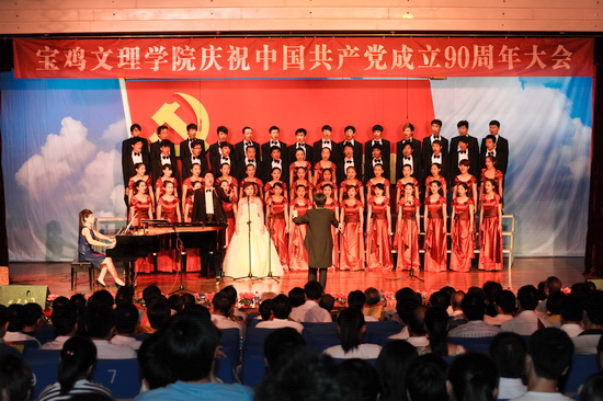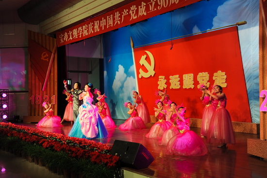 随后,学院举行了庆祝建党90周年“红色经典合唱音乐会”。音乐会上,一首首红歌结合现代化的声光电技术,将观众的心带进了党90年的历史与辉煌。混声四部合唱《东方红》、《没有共产党就没有新中国》、《十送红军》、《五彩云霞》、《四渡赤水出奇兵》、《山丹丹开花红艳艳》、《松花江上》、《游击队歌》、《绣红旗》、《解放区的天》、《祖国颂》等歌曲深情回顾了党从建立到带领人民实现民族独立的征程。混声四部合唱《beat365在线唯一官网校歌》以其欢快的节奏展示了我院在大学文化建设方面的成就和师生员工的精神风貌。配乐诗朗诵《颂歌献给党》诵出了文理人50余年办学历史及各项事业取得的成果。《健身排舞》融合体操等动作表达了文理人对党的敬仰与热爱之情。女声二重唱《党啊,亲爱的妈妈》深情歌颂了党的丰功伟业。女声独唱《在希望的田野上》、男女声二重唱《走进新时代》、男女声三重唱《红旗飘飘》、男女声二重唱《阳光路上》、合唱《走向复兴》等唱出了党改革开放以来领导全国人民逐步实现民族复兴的伟大征程。整个音乐会气势磅礴、高潮迭起。音乐会在全体演职人员与现场观众共同高唱《歌唱祖国》声中落下了帷幕,在优美旋律中,院领导走上舞台,与全体演职人员合影留念。
