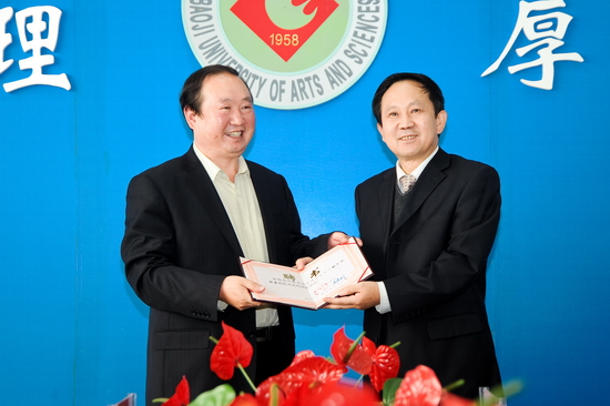 聘任仪式上,王志刚代表学院对额尔敦白音教授受聘为我院特聘教授表示热烈欢迎和衷心感谢。他从办学历史与传统、师资队伍、学科建设与科研工作、区位优势、管理规范、人才培养质量、评估获优、发展中的大学等八个方面简要介绍了学院的基本情况。他说,中国语言文学学科是我院新增硕士学位授予单位立项建设授权学科,也是我院的优势学科和特色学科,在立项建设期间得到额尔敦白音教授的加盟和指导,一定会使中国语言文学学科更上新台阶。额尔敦白音教授表示受到学院的聘请十分荣幸!他说,会尽己所能为我院中国语言文学学科的发展贡献力量。最后,王志刚向额尔敦白音教授颁发了聘书。