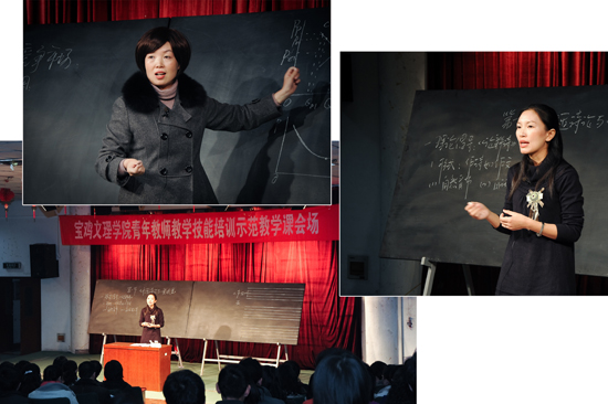 培训报告结束后,组织了示范教学活动。示范教学分文科、理工科两个组同时进行。邀请了我院历年青年教师讲课竞赛获得一等奖的中国语言文学系教师王玉珠、经济管理系教师王静华、计算机科学系教师张浴华和数学系李莹为全院青年教师做示范教学。