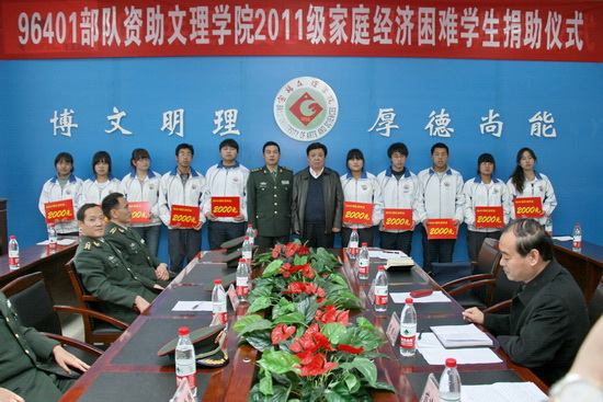 在捐助仪式上,96401部队首长为我院2011级10名家庭经济困难学生每人发放助学款2000元,共计20000元。