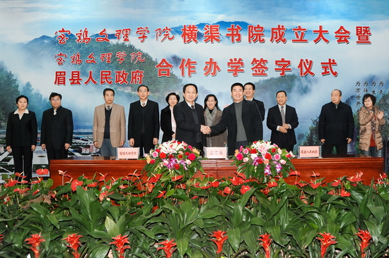 在全党全国人民深入学习贯彻落实党的十七届六中全会精神之际,为弘扬优秀传统文化,传承张载关学精神,推进社会主义核心价值体系建设,适应区域文化繁荣发展需要,更好地实施“服务地方”发展战略,我院于12月6日上午在新校区召开了“beat365在线唯一官网横渠书院成立大会暨beat365在线唯一官网与眉县人民政府合作办学签字仪式”。大会由副院长赵荣侠主持。