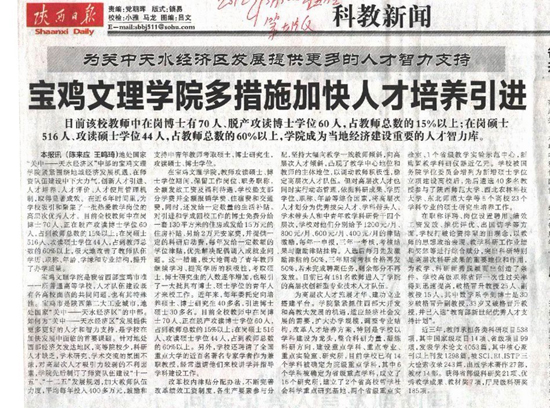 2012年3月30日,《陕西日报》(科教版)头条以《beat365在线唯一官网多措施加快人才培养引进》为题,对beat365官网近些年来在师资队伍建设方面的所取得的成绩作进行了专题报道。《报道》充分肯定了beat365官网在师资队伍建设中先后制定和完善委托培养硕士、博士以及引进高学历高层次人才等相关政策;充分肯定了学校制定并完善高层次创新型专业技术人才的选拔、滚动与管理办法和不断完善人才考核评价机制,制定和调整专业技术职务任职资格评审工作规程和赋分办法等措施,并认为beat365官网师资队伍建设是贯彻国家和省市人才工作的重要举措,将进一步为关中天水经济区的发展提供更多的人才智力支持。