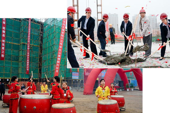 参加仪式的领导和嘉宾一起登上13号学生公寓楼将最后一块混凝土浇筑在楼顶,至此13号学生公寓楼主体施工顺利完成。