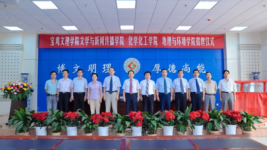 9月6日,beat365官网在新校区甘棠厅举行文学与新闻传播学院、化学化工学院、地理与环境学院揭牌仪式。党委书记、校长王志刚,党委副书记米晓东、李全武,副校长傅志军、赵荣侠、杨子元等出席会议。王志刚发表讲话并与米晓东为三个学院揭牌,傅志军宣读《关于中国语言文学系等三个系更名为二级学院的通知》(宝文理院党字[2012]22号),赵荣侠主持揭牌仪式。