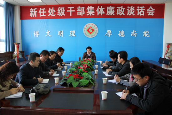 11月28日下午,校纪委在新校区第一会议室对新提拔任用的11名处级干部进行集体廉政谈话。教育科学与技术系主任孙新,杂志社社长、学报编辑部主任周民,外国语言文学系副主任姚艳梅,物理与信息技术系副主任王参军、张亚妮,地理与环境学院党总支副书记、副院长于建伟,武装部副部长、保卫处副处长杨辉,基建处副处长陶炜,继续教育学院副院长田富平到会。纪委书记米晓东作重要讲话,副书记邓忠良主持会议。