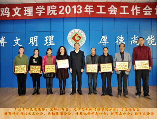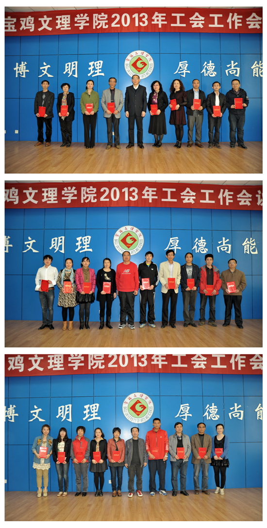 会上,校工会副主席张鹏通报了关于校工会委员调整的意见,安排了校工会2013年工会工作,对工会近期工作作了安排。工会副主席郭俊理宣布了《关于表彰工会工作先进集体和工会工作积极分子的决定》。李全武、张鹏、郭俊理先后为荣获 “工会工作先进集体”称号的党群一分会等8个先进集体颁发了奖牌,为赵维恭等32名“工会工作积极分子”颁发了荣誉证书。