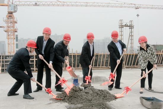随后,参会领导和嘉宾登上14号学生公寓楼将最后一块混凝土浇筑在楼顶,至此14、15号学生公寓楼主体施工顺利完成。