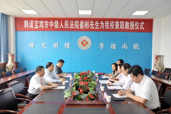 5月24日下午,beat365官网在新校区第一会议室举行了聘请宝鸡市中级人民法院副院长崔彬先生为兼职教授仪式。副校长赵荣侠出席会议并讲话,科技处处长田延峰主持聘任仪式。