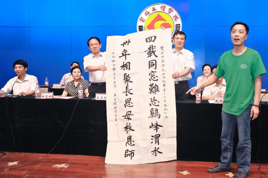 中文系(现为文学与新闻传播学院)79级校友、西安碑林博物院研究员王祺祎代表79级校友对学校的领导和老师们表示衷心的感谢。他深情追忆了在校期间的学习生活情况和同学之谊,表达了对母校和老师的感恩之情和祝福之意。他用自己亲手书写的一副对联表达了79级校友的心愿,并将这一书法作品赠送给母校。