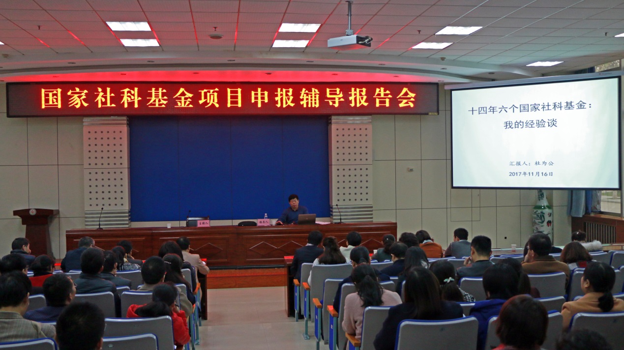 杜为公教授结合自己在14年里成功申报6个国家社科基金项目的坎坷经历和丰富经验,从项目选题、项目论证、科研经费的编列等方面详细地介绍了如何构思和撰写国家社科基金项目申报书。他特别指出国家社科项目申报的一些技巧和方法,并对申报过程中可能遇到的问题进行了耐心、详细的解答。杜教授的报告针对性较强,语言风趣幽默,帮助教师掌握了申报国家社科基金项目的要领,也极大地激发了教师申报国家社科基金项目的热情和信心。(社科处 文、图/季敏)