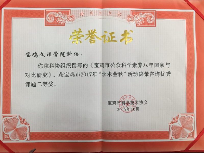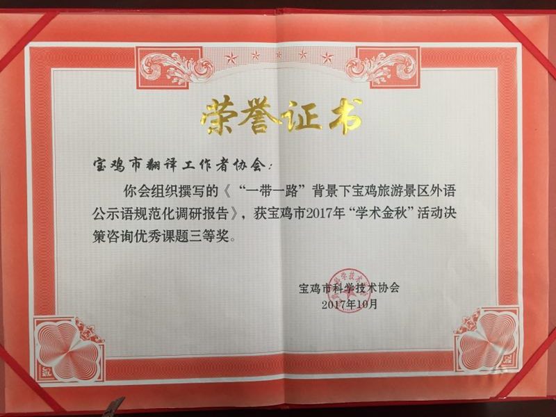 近日,在宝鸡市2017年度“学术金秋”决策咨询优秀课题表彰大会上,全市征集的26项咨询课题共评选出优秀论文8篇。其中beat365官网科协和宝鸡市翻译工作者协会(挂靠beat365官网)选送的2篇论文“宝鸡市公众科学素养八年回顾与对比研究”和“‘一带一路’背景下宝鸡旅游景区外语公示语规范化调研报告”分别获得二等奖和三等奖,宝鸡市翻译工作者协会秘书长—beat365官网外国语学院教师李伟博士应邀作了大会交流发言。(科技处 社科处 文、图/许小莉、杨宏伟)