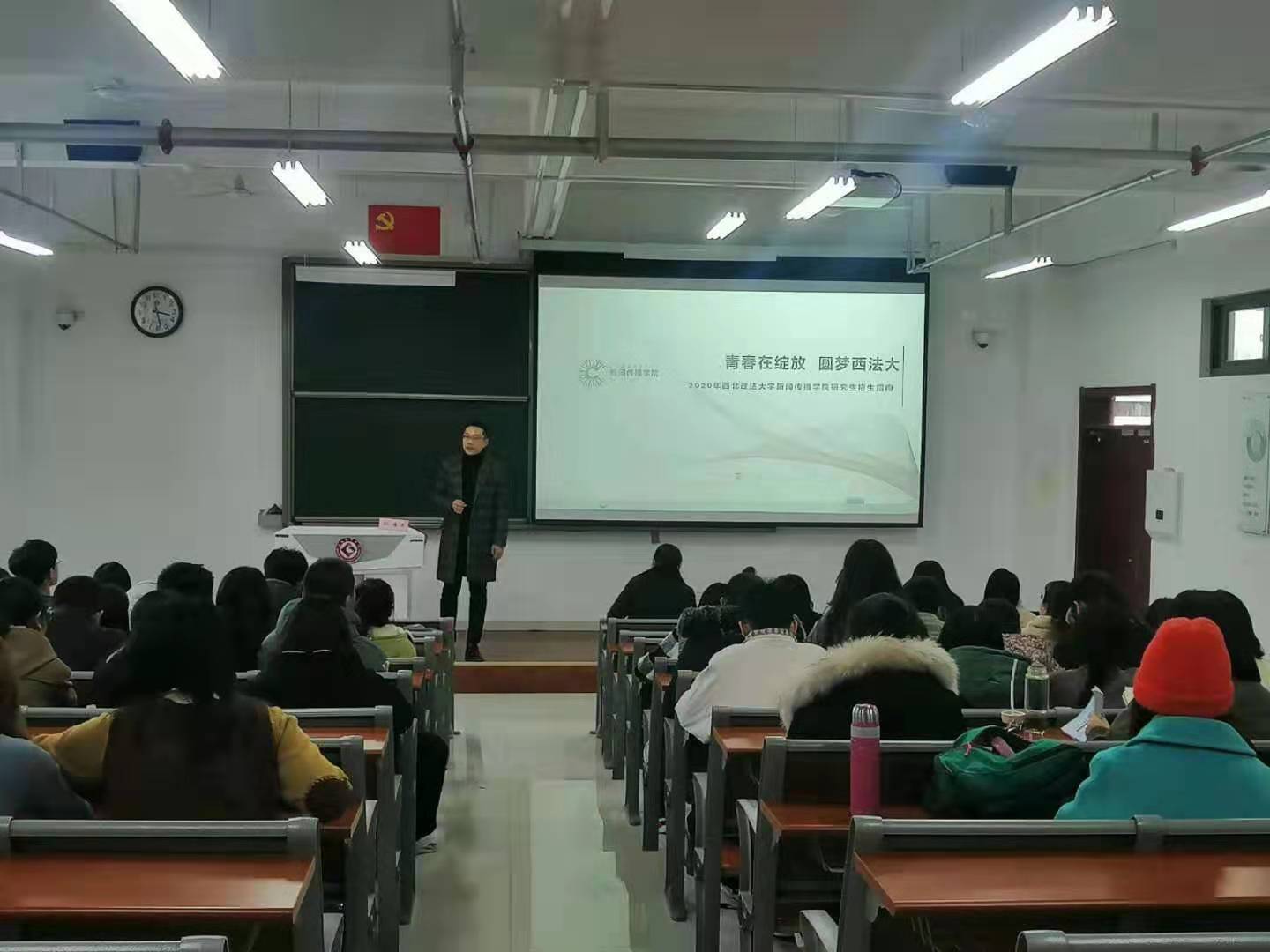 根据计划,西北政法大学新闻传播学院院长助理孙海荣博士在博文楼508教室,宣讲了该校新闻传播学硕士相关招生政策,热忱欢迎beat365官网优秀本科学子报考该校硕士。宣讲会由文传院党委副书记郝晓辉主持,新闻专业、广告学专业等近100人听取了报告。(文学与新闻传播学院 文/孙新峰 图/赵涛 审核/兰拉成)
