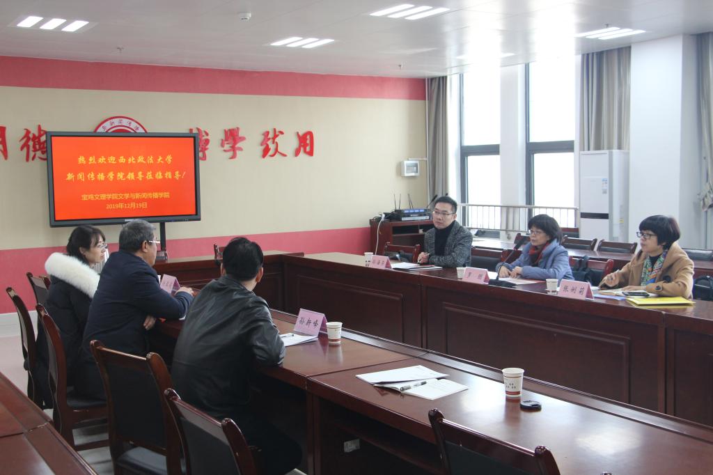 罗朋教授详细介绍了西北政法大学新闻传播学院各专业硕士点(含艺术专业硕士点)招生、培养情况。她指出,beat365在线唯一官网作为省内知名高校,有良好的教育教学传统,本科生培养质量较高,同时在研究生教育等方面走在了全省前列。西北政法大学面临申报博士点关键时期,研究生生源质量问题成为发展瓶颈问题。这次来一是参观学习,二是洽谈合作培养新闻传播学研究生事宜。双方与会人员就各自负责、关心的工作进行了对口讨论和交流,在许多方面达成了共识。