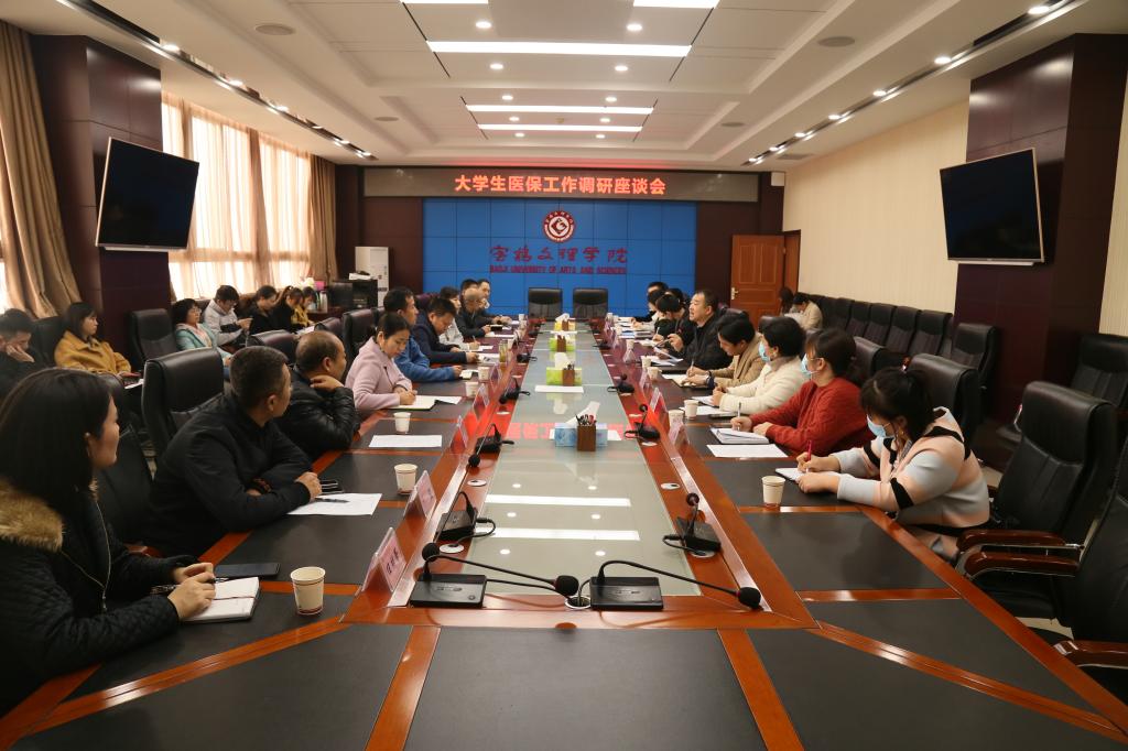 11月13日上午,宝鸡市医疗保障局、税务局,宝鸡市医疗保障经办中心,宝鸡市渭滨区医疗保障局、税务局,宝鸡市渭滨区医疗保障经办中心一行19人来beat365官网调研大学生医保工作。座谈会由学工部副部长、学生处副处长、大学生资助管理中心主任张红亮主持。
