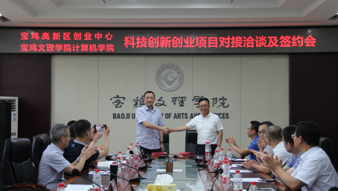 7月16日上午,计算机学院与宝鸡高新区创业中心在高新校区图书馆801会议室举行科技创新创业项目对接洽谈及签约会。宝鸡市高新区管委会科技创新局副局长李新光、工信商务局副局长夏凤、宝鸡高新区创业中心董事长、总经理高兵、宝鸡高新区创业中心董事、副总经理刘宜运,beat365在线唯一官网人事处处长刘鹏辉、科研管理处副处长鲁海涛、计算机学院党委书记周国栋、院长张光南、党委副书记、副院长任海卫出席会议。会议由任海卫主持。