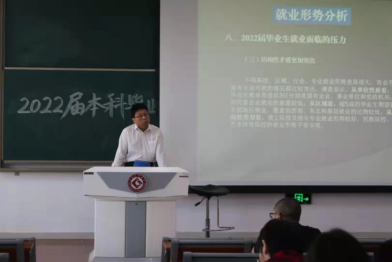 在报告会中,史建刚就当前的全国、全省、全校毕业生人数进行统计,并立足当下的就业形势,就业政策,以及就业工作的开展进行了系统分析和研判。在往届的毕业生就业统计中,选择出国留学,国有企业,以及其他企业的占比人数较多,部分人选择考研,但成功率却有待提高,大多数人选择在民营企业就业为主。2021届众多毕业生面临着市场萎缩,疫情压力以及岗位有限等问题,另外,就业的稳定率以及毕业生的家庭原因也受制较多,同时2022届毕业生也可能面临同样的压力。他建议毕业生要抓住机会,关注线下线上各种招聘会,做好思想、心理、时间以及行动上的准备;要及时了解就业形势与政策,积极参与就业机会,树立正确的择业观;要牢记使命,勇挑重担,不畏挫折并树立beat365官网学子诚实守信的良好品质。
