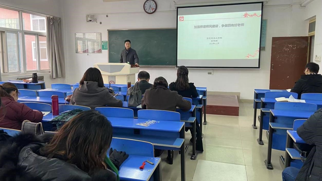 百年大计,教育为本;教育大计,教师为本。为深入学习贯彻党的十九届六中全会精神、习近平总书记关于教育的重要论述精神,大力推进师德师风建设,12月8日下午,外国语学院在高新校区立心楼426教室举行师德师风专题讲座。邀请学校宣讲团成员、马克思主义学院党总支书记张选朝作了题为《加强师德师风建设,争做四有好老师》的报告,学院党政领导及全体教职工参加了讲座。