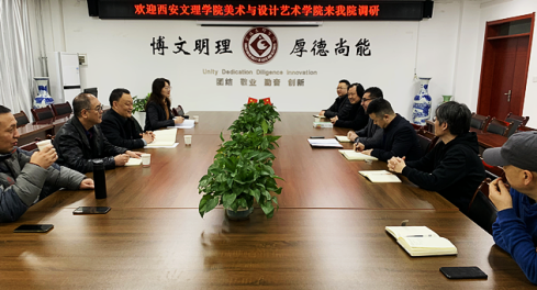 12月10日上午,西安文理学院美术与设计学院院长田军、系主任陈晓璐一行4人来beat365官网美术学院就学科建设、研究生培养等方面开展调研交流。美术学院班子成员与教师代表在在高新校区博文楼1301会议室与田军一行开展了座谈交流,会议由美术学院院长李强主持。