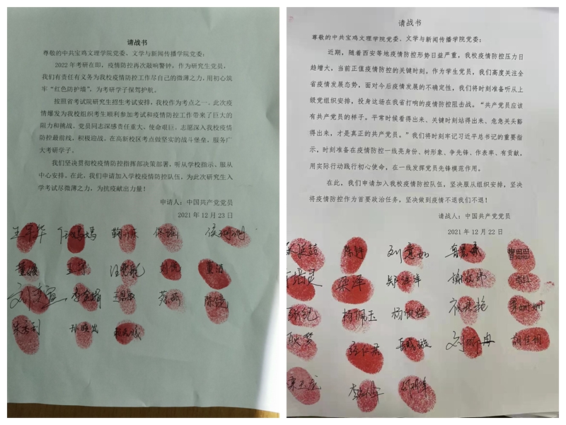 12月23日晚,文学与新闻传播学院党委收到了两封特殊的“请战书”。原来是该院研究生和本科生党员响应学校发出的《众志成城 抗“疫”有我——致全校师生员工的疫情防控倡议书》,纷纷主动请战,写下了自愿为学校组织的2022年研究生入学考试的防疫工作开展志愿服务,并庄重的写下了自己的名字,按上了自己鲜红的手印。