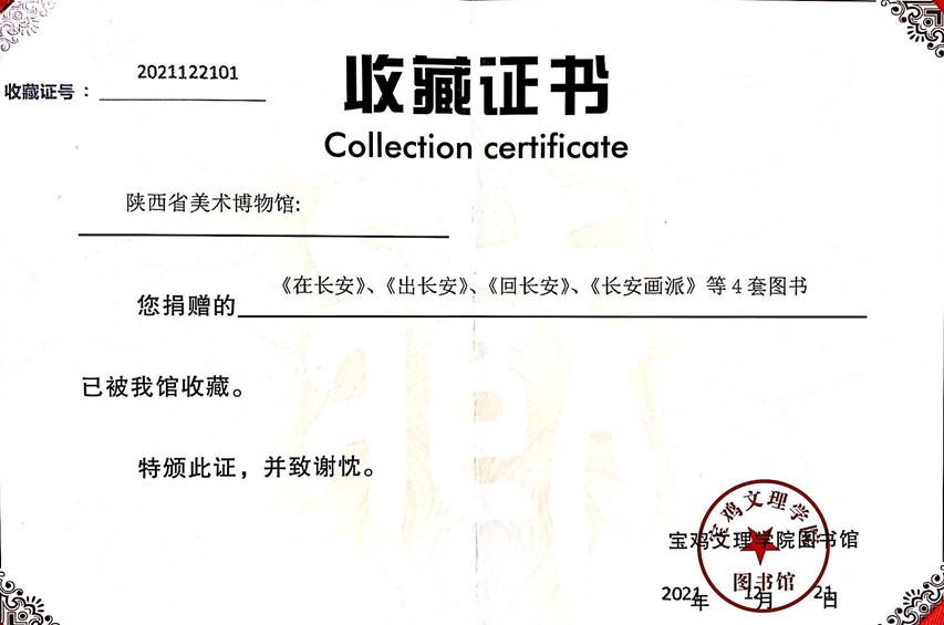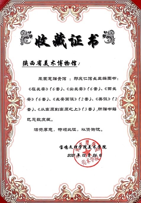 近日,陕西省美术博物馆向beat365官网图书馆与美术学院捐赠由邢庆仁馆长主编的《在长安》《出长安》《回长安》《长安画派》《美谈》《从高原到高原之上》等多套图书画册,为beat365官网图书馆的图书收藏与美术学院的学科资料库建设给予支持与帮助,图书馆与美术学院分别向陕西省美术博物馆颁发了图书收藏证书。