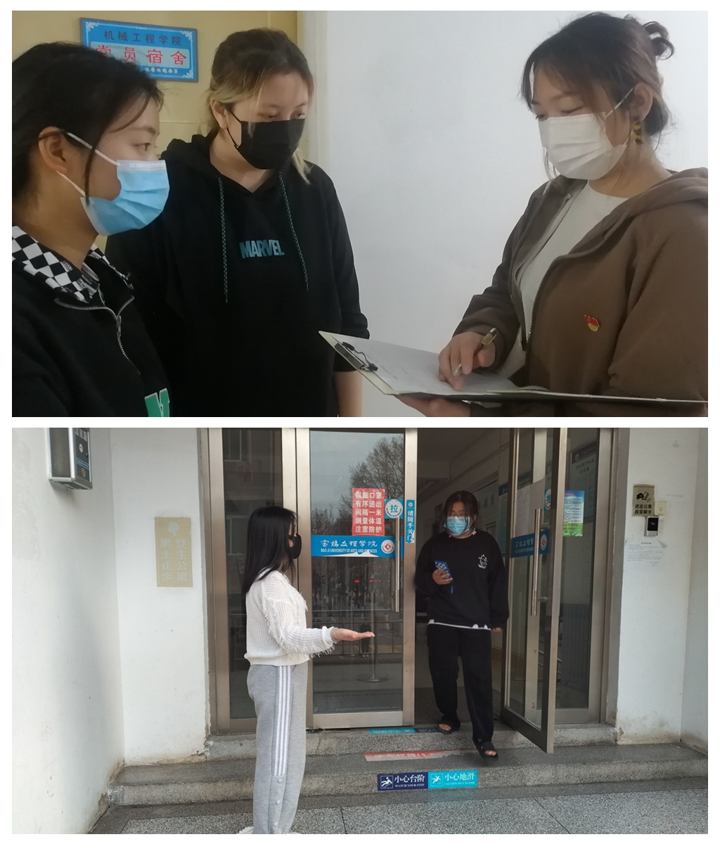 “监督员”——为有效推进学院防疫工作,党员先锋队督促对接宿舍同学完成每日健康打卡、校区签到、核酸检测等工作,并在教学楼、宿舍楼设立监督岗,提醒学生时刻佩戴口罩,并保持安全距离,增强疫情防控意识。
