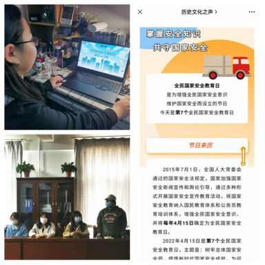 创新形式,积极宣传。为营造良好的宣传教育氛围,使总体国家安全观入脑入心,学院创新宣教方式,采取线上线下相结合,通过宣传栏、两微一端等多种途径,采用微视频、音频、图解、微动漫等多种方式,加大宣传力度,集中开展国家安全宣传教育引导。疫情期间,及时了解学院师生动态,以主题“云”班会、主题党团活动、线上讨论等形式,将国家安全教育融入大学生思政课程,做好专题教育的精准引导,线上线下同步发力,营造良好的国家安全学习氛围。