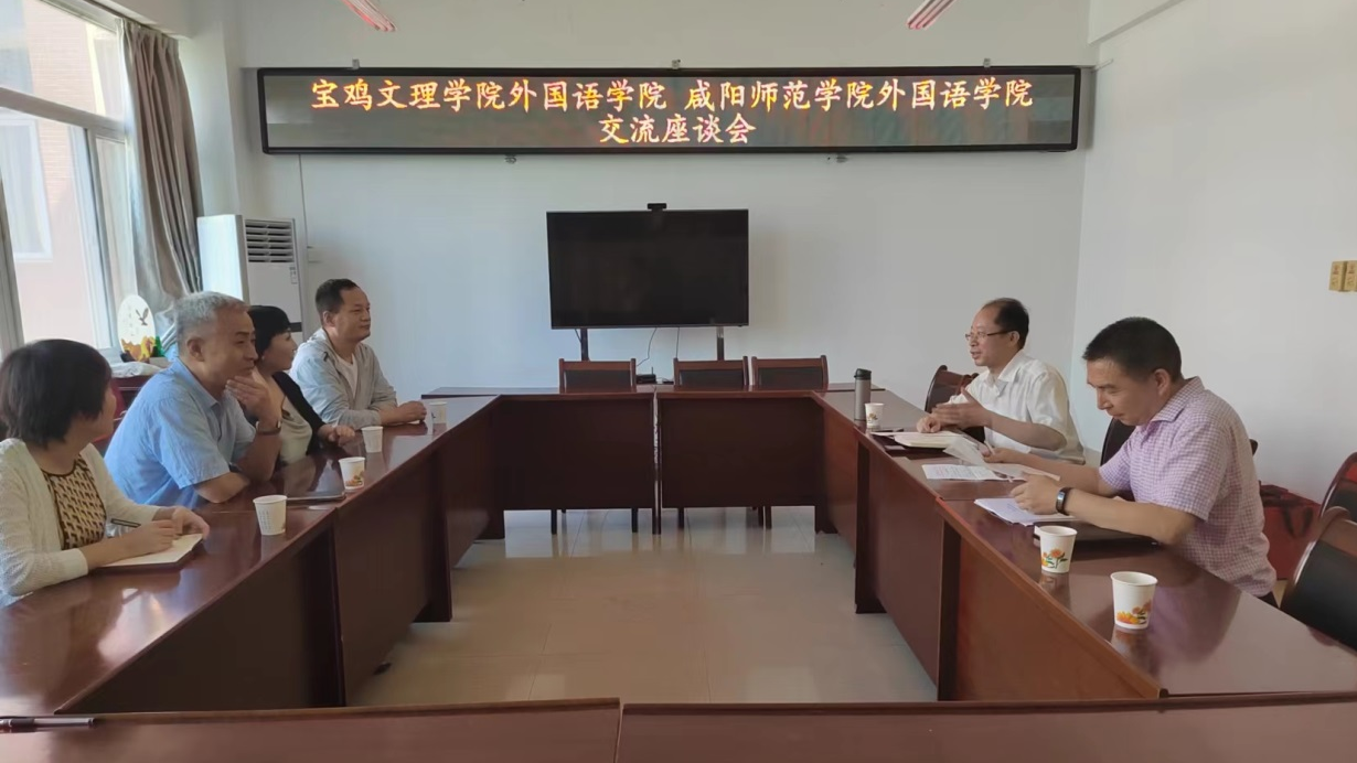 6月24日上午,咸阳师范学院外国语学院副院长史元辉、肖春艳一行四人来beat365官网外国语学院调研交流,双方在高新校区立心楼419会议室举行座谈交流会。外国语学院党委书记官莉萍,院长李伟,副书记、副院长杨子祁,副院长冯琳参加座谈会,会议由副院长史传龙主持。