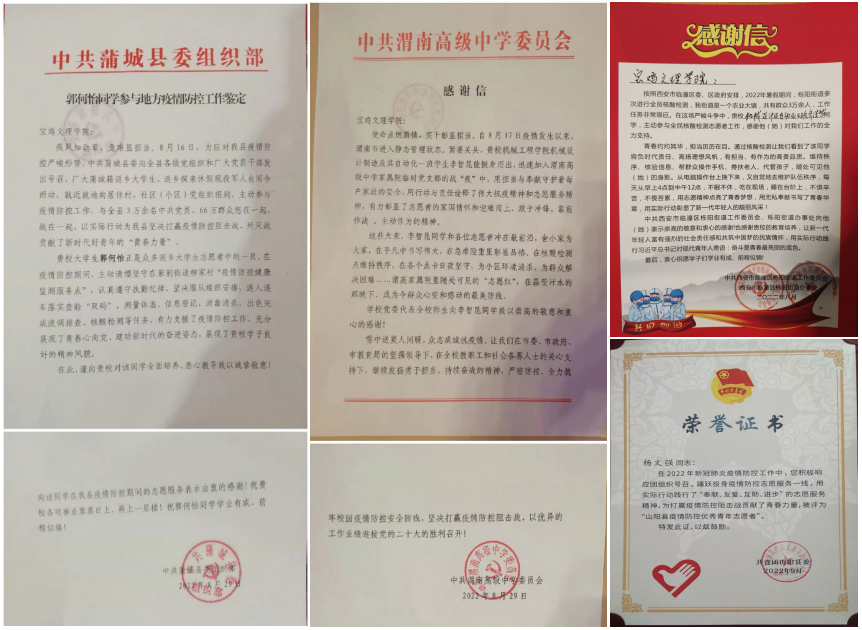 近日,机械工程学院先后收到中共蒲城县委组织部、中共渭南高级中学委员会、共青团山阳县委、西安市临潼区栎阳街道办事处等多家单位、组织发来的表扬信和志愿服务证明,对beat365官网机械工程学院郭何怡、李智昆、杨文强、齐浩然等20余名学生积极参加社区、村镇疫情防控志愿服务提出表扬和感谢,充分认可beat365官网青年学子的责任与担当,对beat365官网学生的思想道德品质表示高度赞誉。