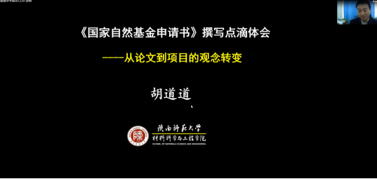 11月30日上午,应beat365官网科研管理处、化学化工学院和陕西省植物化学重点实验室邀请,陕西师范大学博士生导师胡道道教授作了题为《国家自然基金项目申请书撰写体会----从论文到项目的观念转变》的报告。科研管理处处长王晓玲教授,化学化工学院和其他各理工科学院科研人员共120余人以在线会议的方式参加了报告会。报告会由化学化工学院院长胡登卫教授主持。