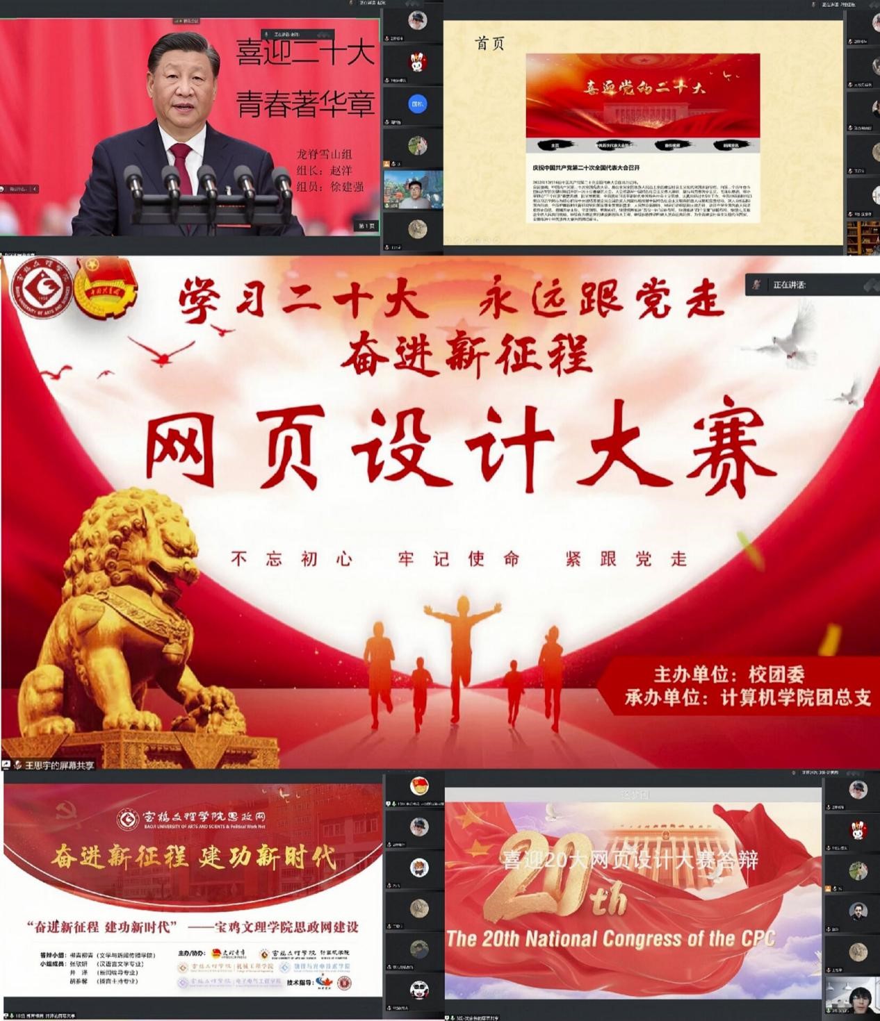 12月21日下午,由校团委主办,计算机学院团总支承办,物理与光电技术学院团总支、机械工程学院团总支、电子电气工程学院团总支、校学生会、校研究生会协办的“学习党的二十大、永远跟党走、奋进新征程”2022年石鼓校区大学生网页(站)设计大赛(线上)决赛在石鼓校区计算机学院举行。计算机学院党委书记周国栋主持本次大赛,院长张光南致词。校团委、学工部、人事处、网络与信息技术管理处等部门负责人、相关学院领导及专业课老师担任大赛评委。