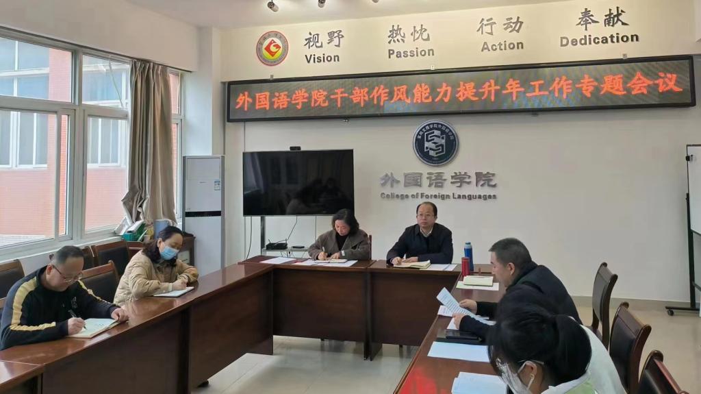 3月20日下午,外国语学院在高新校区立心楼419会议室召开了干部作风能力提升年工作专题会议。学院副科级以上干部、系部(中心)主任和党政办公室人员参加了会议。会议由学院党委副书记杨子祁主持。