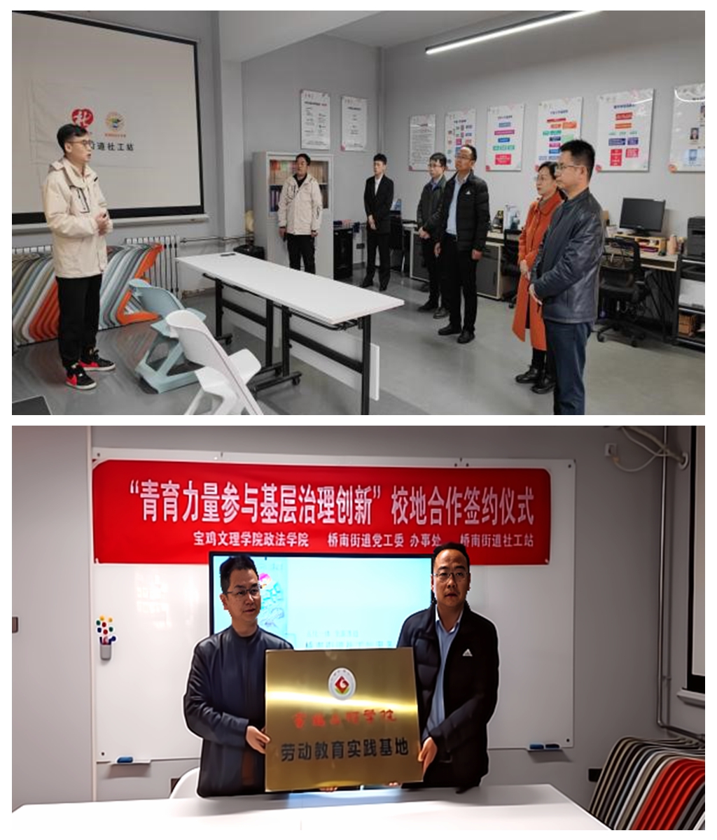 3月23日下午,政法学院与宝鸡市桥南街道办事处共建“劳动教育实践基地”签约授牌仪式在桥南社工站举行。政法学院院长张波、副院长范林,桥南街道办主任陈峰、桥南社工站副站长黄磊及beat365官网部分学生代表参加仪式。