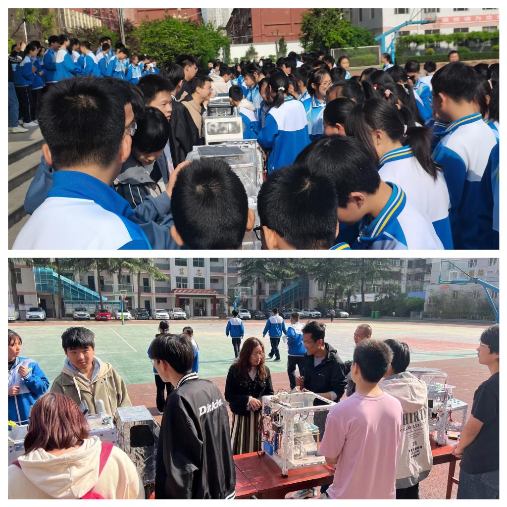 科普志愿团队由宝鸡市机器人智能制造众创空间主任李亮、机械工程学院教师张卫亮带队,向滨河中学师生展示了“智能二次供水水质监测和自动清洗装置”“公交车无障碍自动通行装置”“智能供暖除杂装置”“高原寒区沥青加热搅拌装置”等与生活密切相关的科技成果。通过展示、讲解、体验、互动等多种形式,使师生近距离体验科技成果的智能、方便与快捷,切身感受科技的魅力。