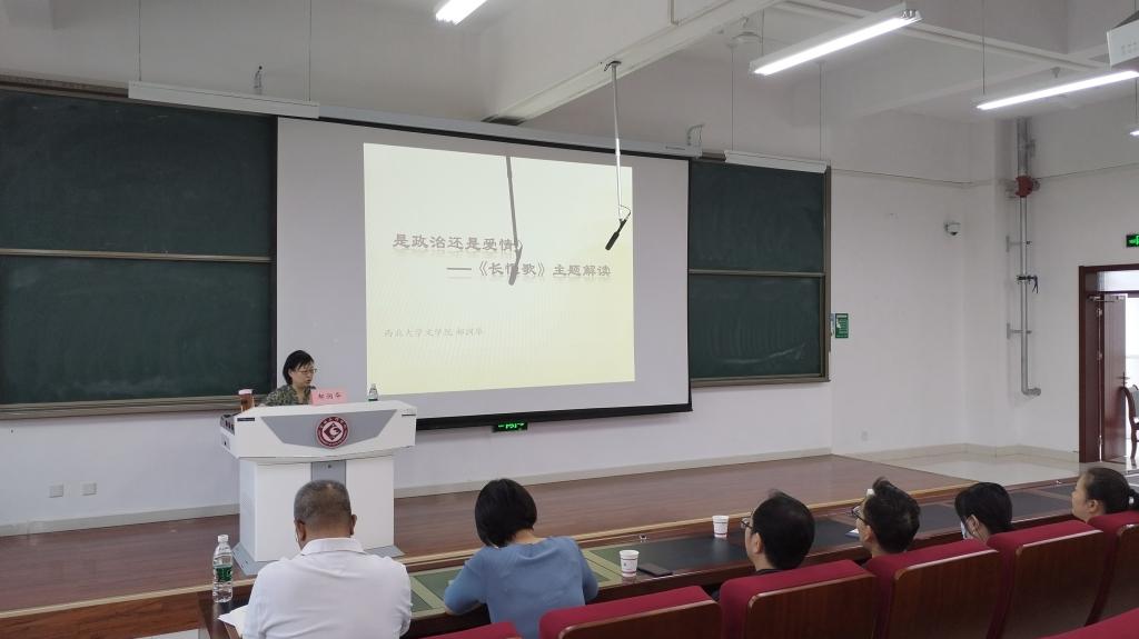5月19日下午,文学与新闻传播学院邀请西北大学古典文献学二级教授、博士生导师郝润华老师在高新校区博文楼副楼105作了题为“是政治还是爱情——《长恨歌》主题解读”的学术报告。文学与新闻传播学院教师及学生共100余人参加了报告会,报告会由文学与新闻传播学院院长兰拉成主持。