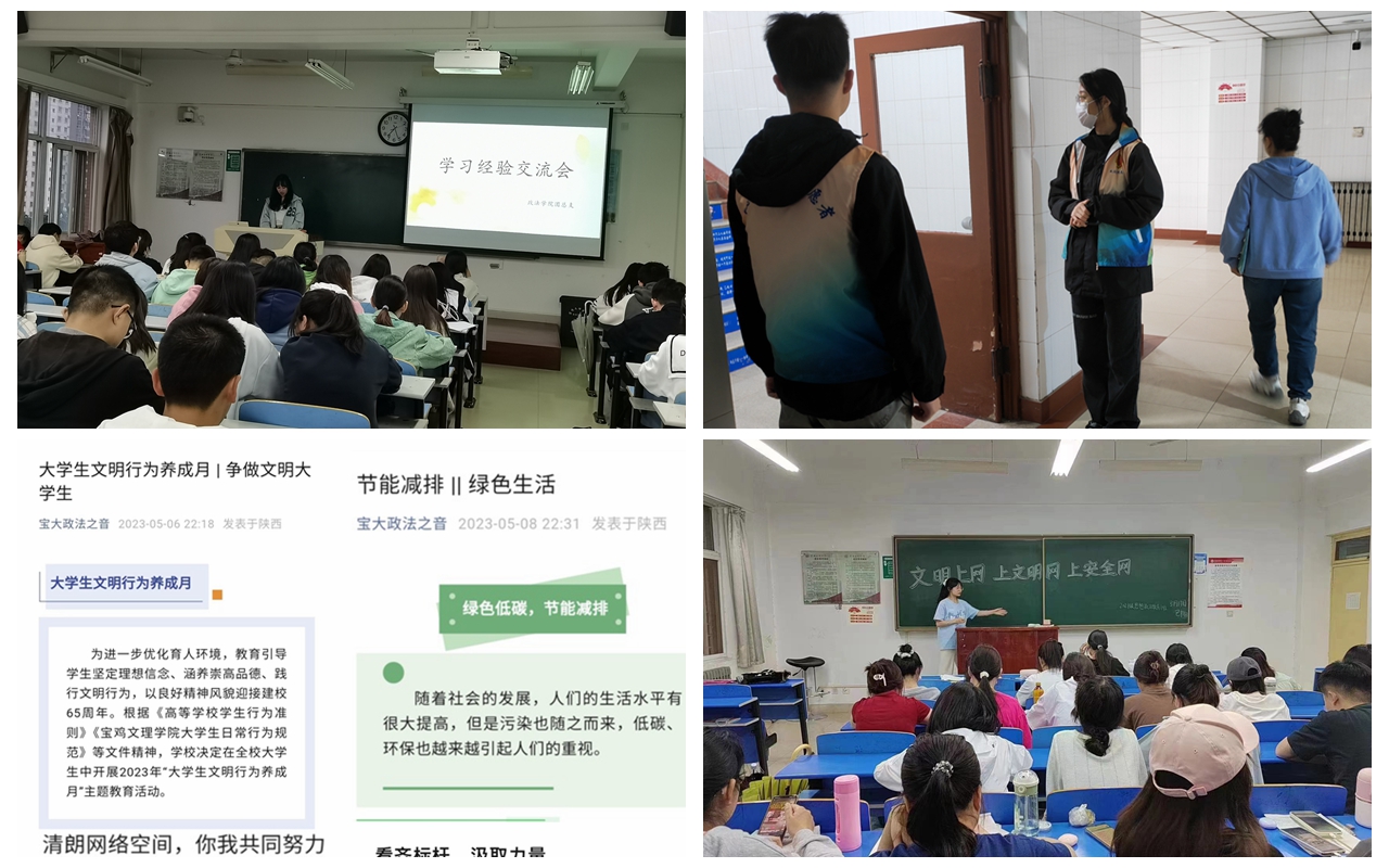 ——强化宣传引导,营造良好氛围。学院通过官方微博、微信公众号推送“争做文明大学生”“清朗网络空间 你我共同努力”“节能减排 绿色生活”等有关文明行为文章;精心制作文明行为宣传海报;召开主题班会和团日活动,形成大力宣传文明行为的良好氛围,引导当代大学生塑造良好形象,讲文明话、办文明事、做文明人。