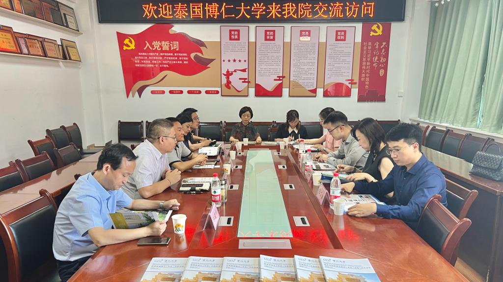 6月13日,泰国博仁大学校长助理兼创新商务与财会学院副院长王珊珊博士、中文国际学院国际事务办公室主任苏泉博士、外事专员向方玉博士一行三人来beat365官网经济管理学院访问交流。经济管理学院院长刘辉、党委书记郝晓炜、副书记薄会颖、副院长刘晓科和杨嘉歆以及青年教师代表参加本次交流活动。