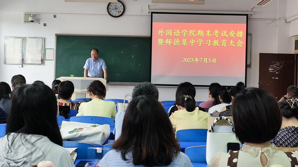7月5日下午,外国语学院在高新校区立心楼426教室召开师德集中学习教育大会,全体教职工参加了学习。大会由学院院长李伟主持。